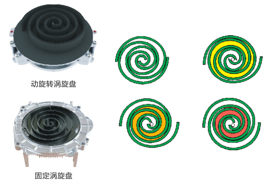 無油渦旋空氣壓縮機(jī)靜渦盤與動渦盤在一定的相位保持下小半徑的平面運(yùn)動,動靜渦盤嚙合形成若干對月牙形封閉的壓縮腔,吸入工作腔的氣體被隨后形成的月牙形的壓縮腔逐漸壓縮,然后又靜盤中心部位排氣口排出。
